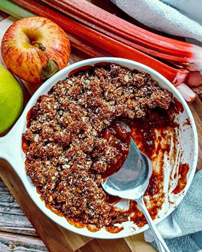 This gluten and refined sugarfree Rhubarb and Apple Crumble Pie is great as a treat dessert or afternoon snack to pair with tea or