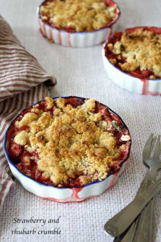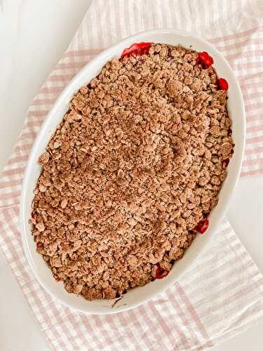A layer of perfectly sweet yet tart strawberries and rhubarb between golden layers of buttery, macaroon-infused crumble.