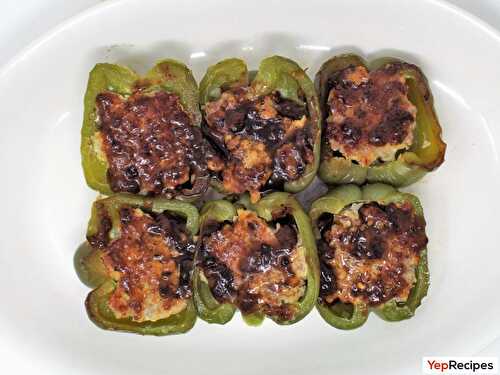 Pan-fried bell peppers stuffed with pork, onion, and breadcrumbs then drizzled with a sauce made up of soy sauce and mirin.