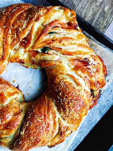 Soft brioche-like swirl bread filled with buffalo mozzarella and ham.