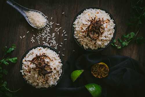 This light and fluffy coconut rice is the perfect blend of coconut milk, garlic, and fresh lime, creating a nicely balanced rice to accompany many meals.