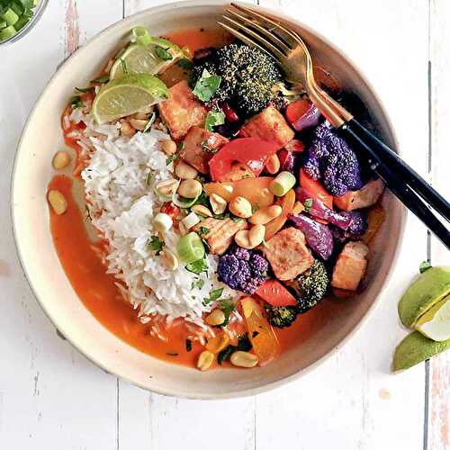 Thai Coconut Tofu Red Curry with Oven Roasted Vegetables is bursting with flavor and texture.