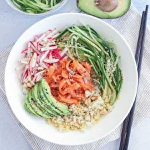 Low Carb Smoked Salmon Sushi Bowl is made with cauliflower rice, smoked salmon, crunchy fresh veggies, creamy avocado and drizzled with a super easy yet flavorful 3-ingredient dressing.