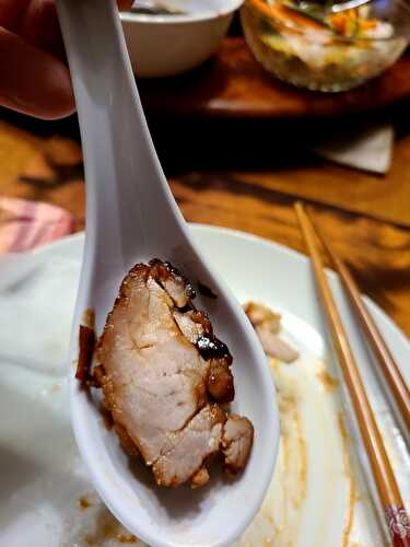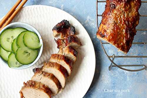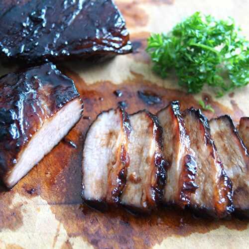 Sliced pork shoulder roasted in the oven with a sweet chinese style BBQ glaze.