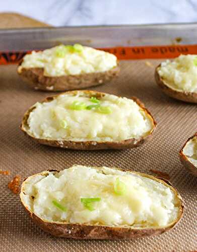 Deliciously healthy twice baked potatoes are creamy mashed potatoes that are stuffed into a potato skin and topped with a little bit of cheese.