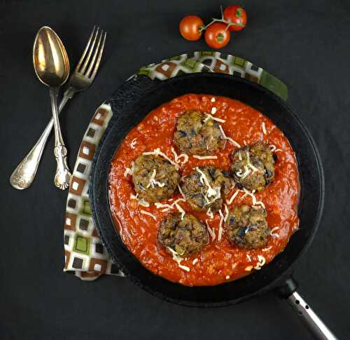 These meatless mushroom meatballs are smothered in homemade tomato sauce.