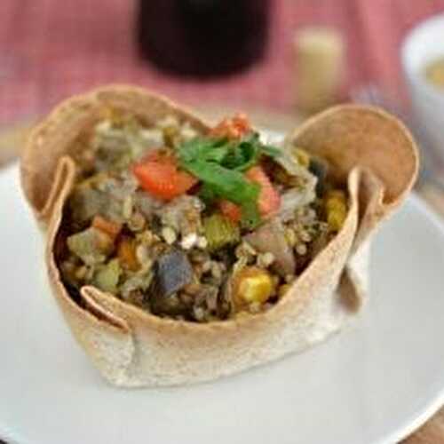 Colorful, delicious taco salad in tortilla bowls is easy to make.