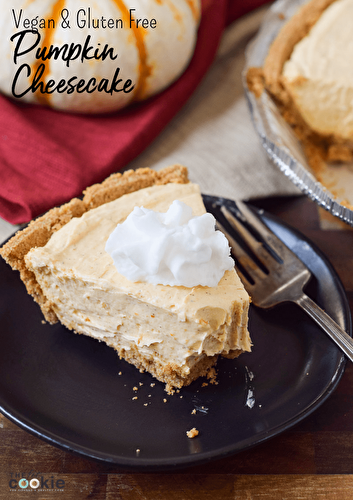 Creamy and fluffy vegan pumpkin cheesecake with gingerbread crust.