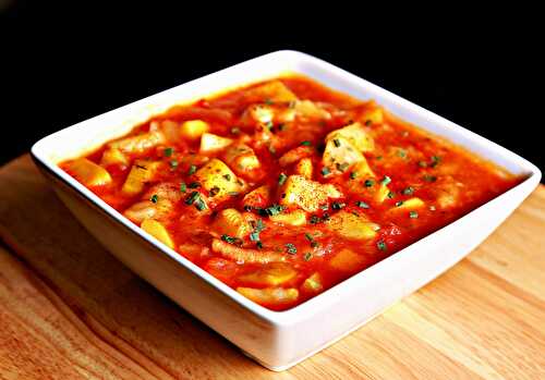 Healthy, gluten-free, vegan Parsi Wedding Stew of sweet potato, carrot, green peas, bell peppers, flavored with cider vinegar, sugar, Worcestershire sauce.