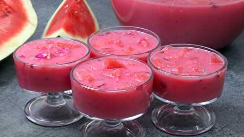 A refreshing rooh afza flavored milky drink with chunks of watermelon and ice cubes making it the most adorable drink served with loads of love.