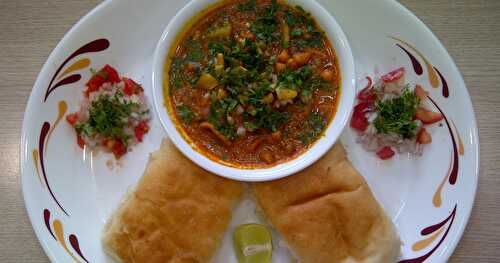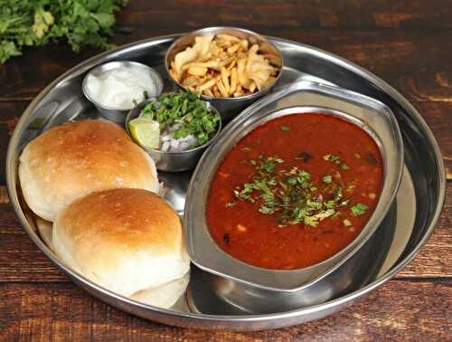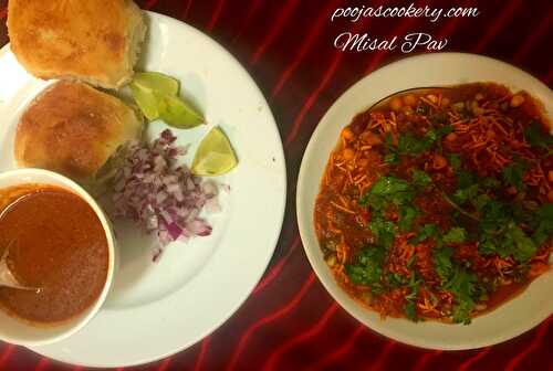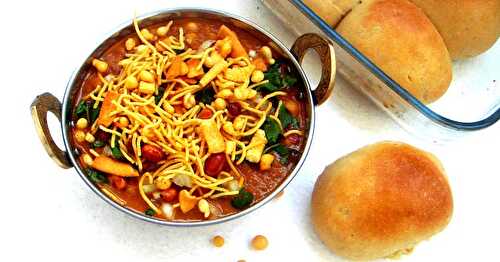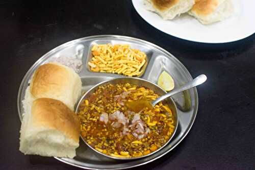 Misal pav is a typical Maharastrian recipe with hot rassa or gravy served on matkichi or mugachi usal and farsan, garnished with coriander leaves.