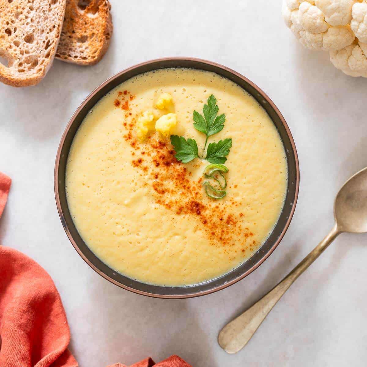 This silky smooth cauliflower soup is bursting with flavour and incredibly easy to make— just roast, blend, and serve!
