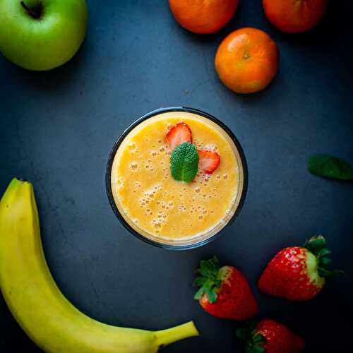 A delicious tropical banana mango strawberry smoothie is the perfect sweet treat.