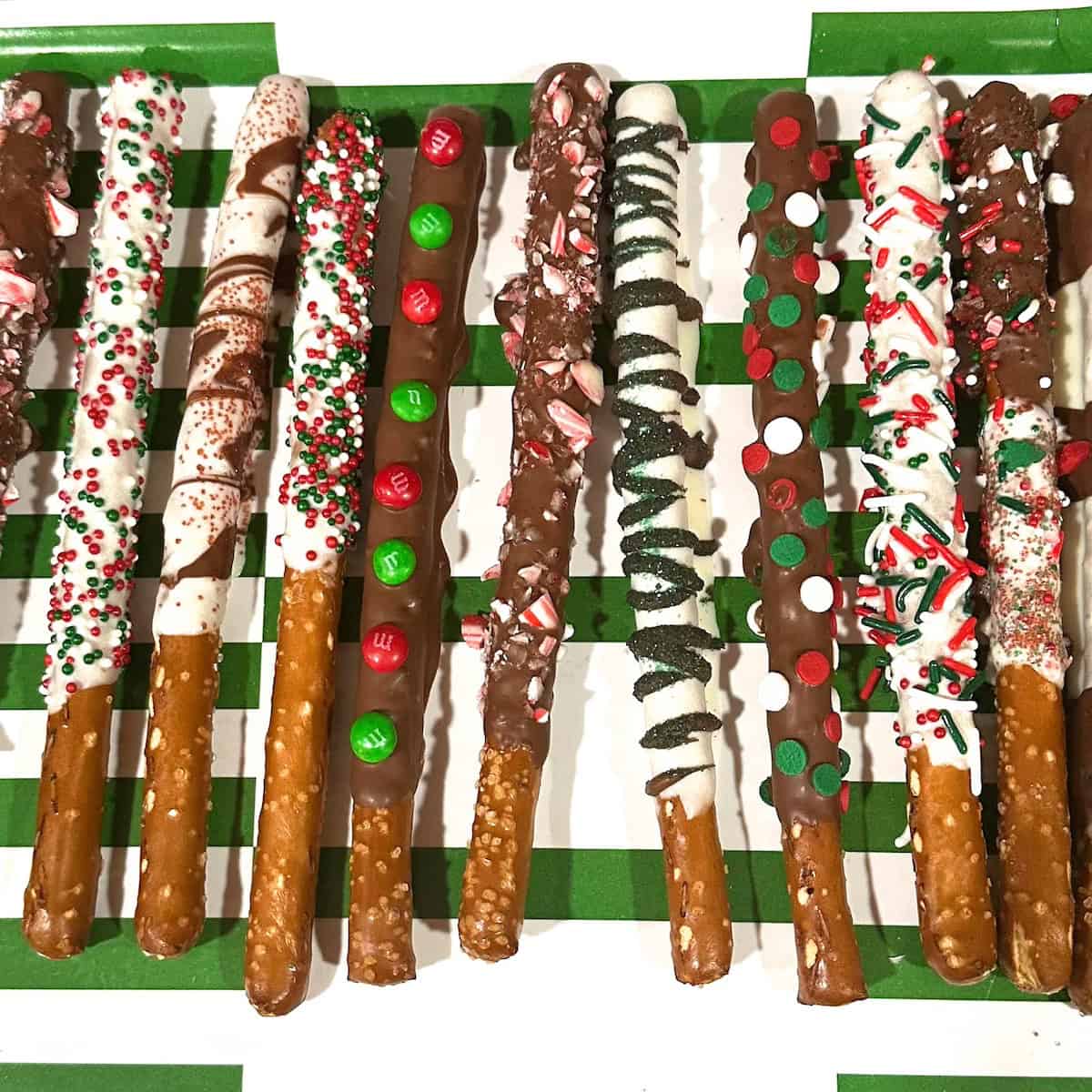 These Valentine's Day pretzels feature large pretzel rods dipped in chocolate and coated in festive sprinkles.