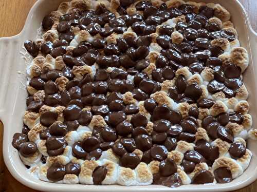 Rich dark chocolate brownies on top of a crispy graham cracker crust and topped with roasted marshmallows and melted dark chocolate chips.