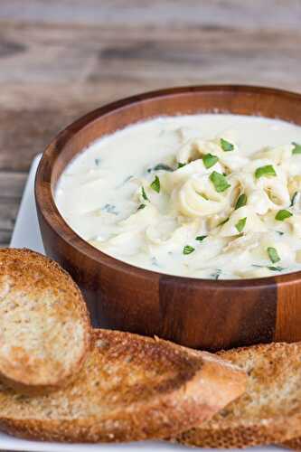 So yummy and filling, Creamy Spinach And Artichoke Soup With Cheese Tortellini #bossartichoke