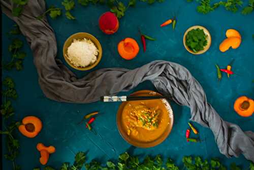 Curried apricot chicken is a spicy chicken stew, filled with onions and sweet peppers and simmered in a peanut butter infused coconut milk.