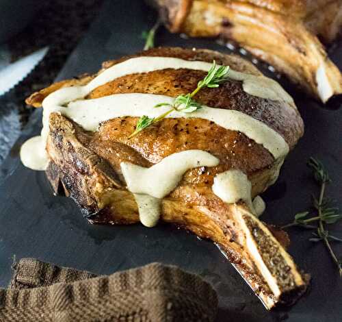 These juicy Pan-Seared Pork Chops are encapsulated in a crisp golden-brown crust and drizzled with a savory dijon cream sauce.