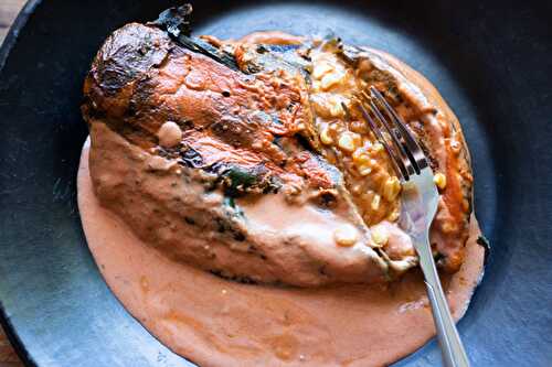 A recipe for Stuffed Poblano Peppers in Tomato Cream Sauce - roasted chiles filled with an oozy, cheesy corn and chorizo mixture in a silky sauce.