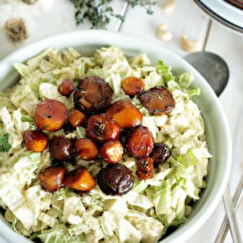 Quick and easy, creamy savoy cabbage salad with delicious caramelised king oyster mushrooms.