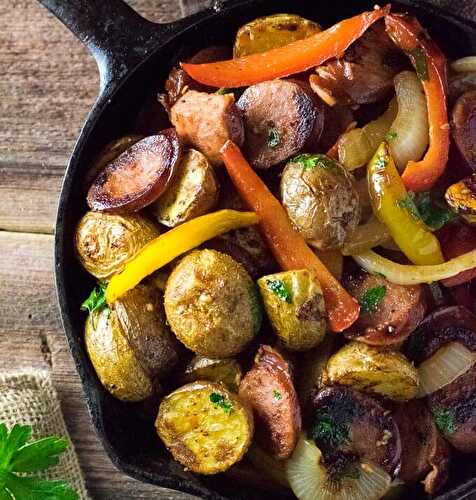 Sausage and potatoes are an easy family dinner featuring seared smoked sausage, peppers, and onions tossed with seasoned roasted potatoes.