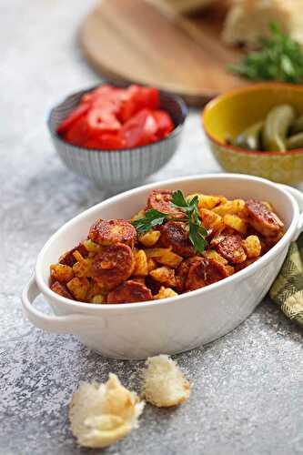 Sosis Bandari or Persian sausage with potatoes is a popular fast food with a spicy taste that is made with sausage, onion, potato, and tomato paste.