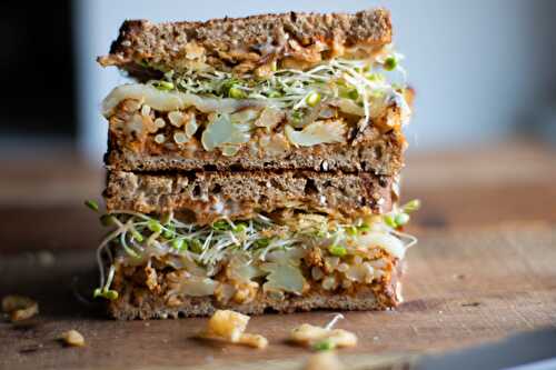 Your dream veggie sandwich recipe: warm roasted cauliflower, spicy sriracha mayo, melty provolone, sprouts, and crispy onions on whole wheat toast!