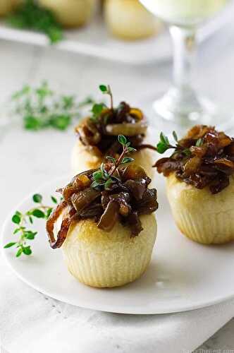 French Onion-Gruyere Mini Boules are hollowed out bread balls stuffed with a rich, creamy Gruyere cheese sauce and topped with caramelized onions.