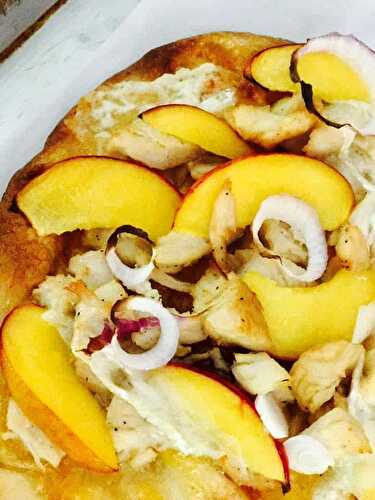 Chicken, brie, and peach meddle together to create a fresh and unique flatbread.