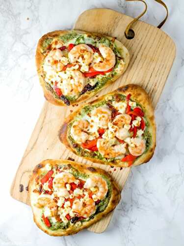 Frozen naan flatbreads form the perfect base for these easy pesto shrimp pizzas!