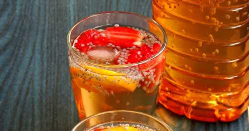 A refreshing dessert drink made with layers of strawberry jelly, fresh fruits, nuts and ice cream.