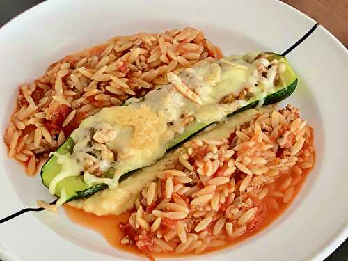 Italian-style Stuffed Zucchini over brown rice Still more zucchini .