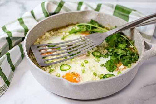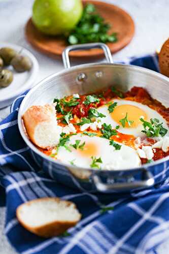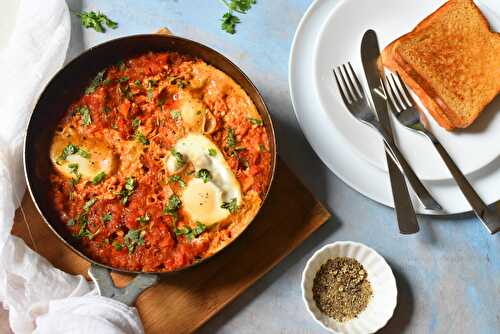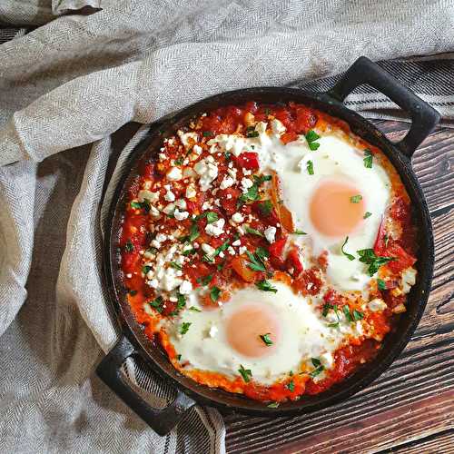 Shakshuka is made with eggs that are poached in a simmering mixture of tomatoes, bell peppers, onions, garlic and some warm spices.