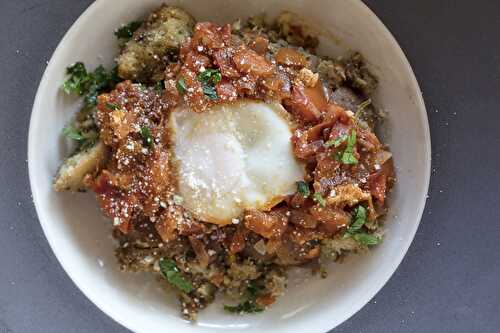 Recipe for Skillet Stuffing Shakshuka made with leftover stuffing and eggs in a smoky, tomato based sauce.