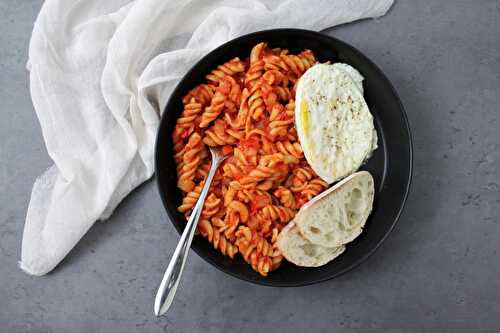 This simple fusion recipe turns shakshuka into a unique vegetarian pasta dinner, complete with a fried egg for added protein.