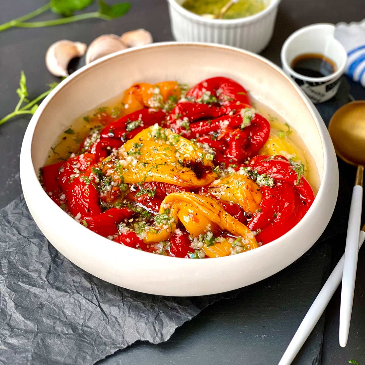 Roasted Pepper Salad is colourful and healthy roasted bell pepper salad with garlic and extra virgin olive oil.