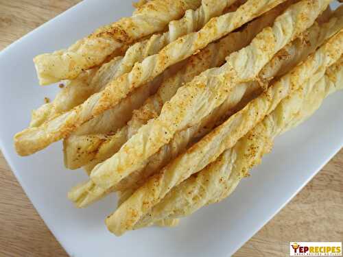 Thin and crisp cheese straws seasoned with Parmesan cheese, garlic and a hint of cayenne pepper.