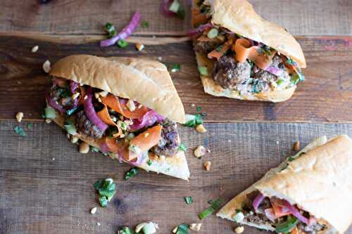 A recipe for a Meatball Bahn Mi with juicy meatballs on a soft, sriracha-mayo-y roll, with quick-pickled veggies, fresh herbs, and chopped peanuts!