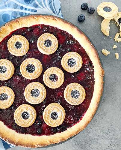 This mixed berry pie has a rather unusual topping: jammy biscuits.