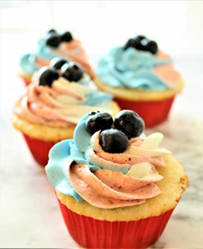 Nothing says Fourth of July like these gluten free red white & blueberry cupcakes! They're filled with a blueberry compote and topped with strawberry swirled buttercream and fresh blueberries :)