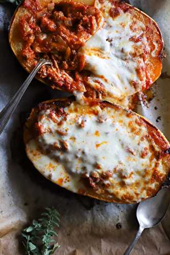 Roasted spaghetti squash boats stuffed with a rich, slow simmered meaty Bolognese sauce, herbs and lots of cheesy mozzarella goodness.