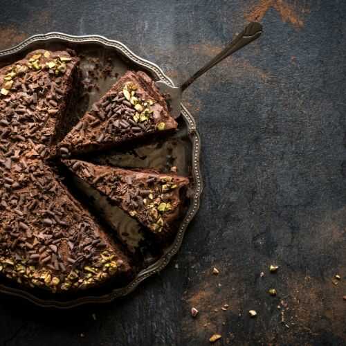 A rich cheesecake is covered with a lightly salted chocolate and caramel topping.