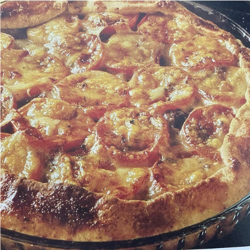 Sausage and Tomato Quiche, with onion, red pepper and smoked cheese, in a shredded potato crust