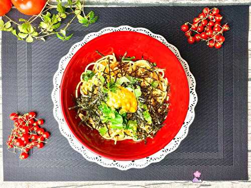 These delicious spaghetti are coated with a sour cream and gochujang (korean chili paste) are spicy and so so satisfying to eat! It's vegetarian and can easily be made vegan too.