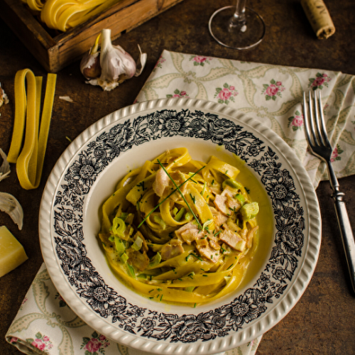 Silky spaghetti with crispy chicken ham in a super thick and cheesy sauce.
