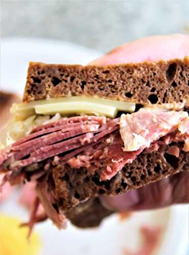 Home Cured Pastrami on Rye Sandwiches with Swiss Cheese and Whole Grain Mustard.