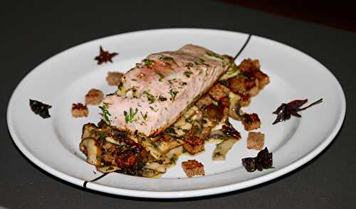 Salmon with gin spices, mushrooms and roasted rye bread is a typical Scandinavian dish.