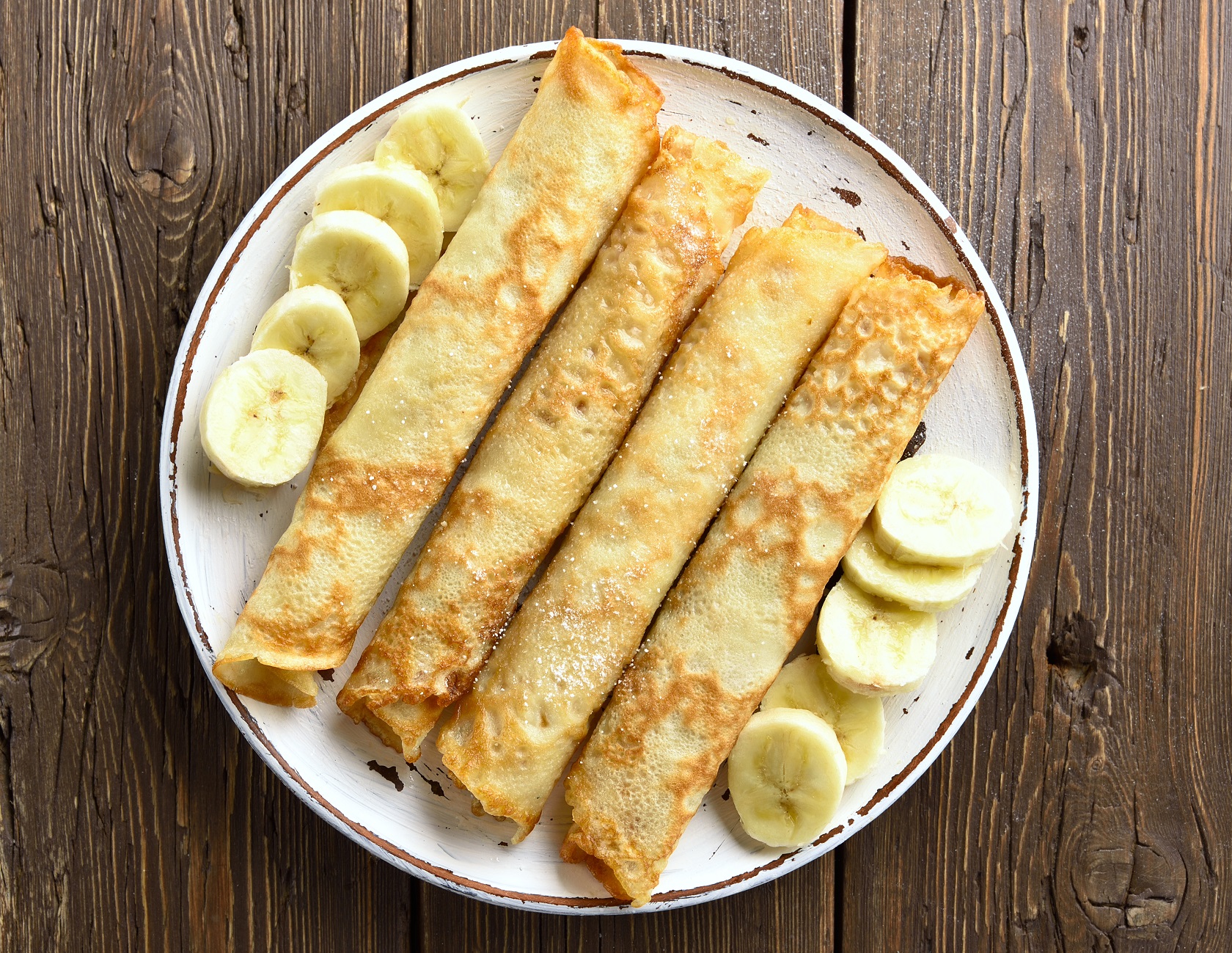 Spread each warm crêpe with peanut butter, add sliced bananas, and serve.