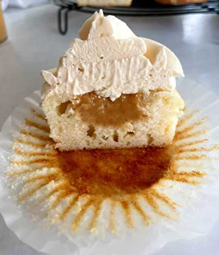 Vanilla cupcakes filled with caramel, topped with caramel buttercream frosting, and drizzled with even more caramel!