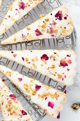 These rose cardamom pistachio shortbread cookies are buttery, melt in your mouth, shortbread cookies dipped in a shiny layer of rose flavoured glaze and will dazzle at your next celebration! These cookies are delicate, buttery, crisp, and perfect for.